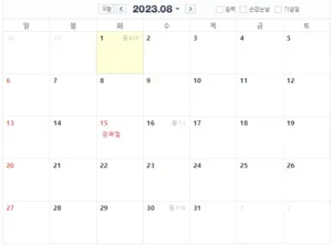 위에 표1을 보시면 대부분의 코스트코 매장은 휴무일이 매월 둘째, 넷째 일요일 입니다. 바로 아래에 8월 달력 사진을 첨부했습니다. 그래서 2023년 8월 달력에 대입하여 보면 양재점이나 광명점, 양평점 공세점 등의 휴무일은 8월 13일과 8월 27일 임을 알 수 있습니다.